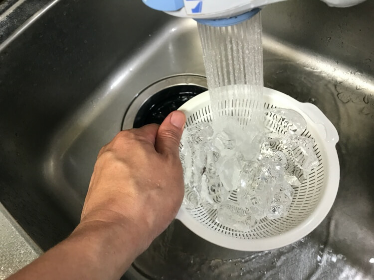 ①氷をザルに入れて軽く水で流します。(氷を入れたグラスに水を入れてすぐに水だけ捨ててもオッケーです)